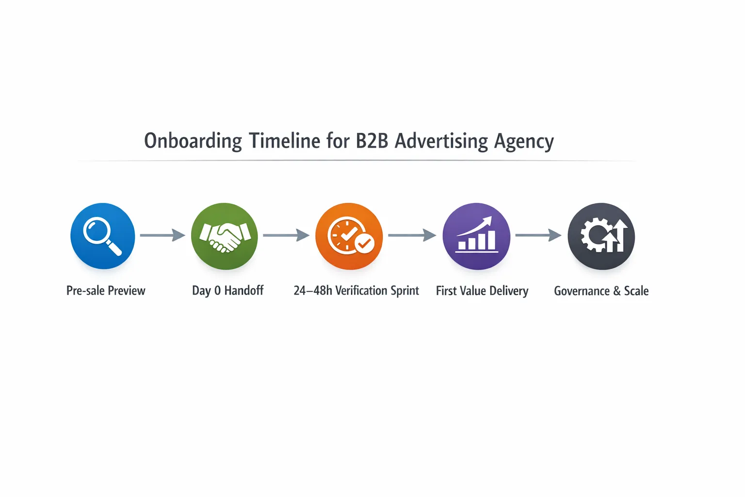 How fast should onboarding be for a B2B advertising agency? Many agencies aim for verified access and measurement readiness within 24 to 48 hours after kickoff, but timelines depend on how quickly client approvers can complete access steps and whether CRM or web changes are required.