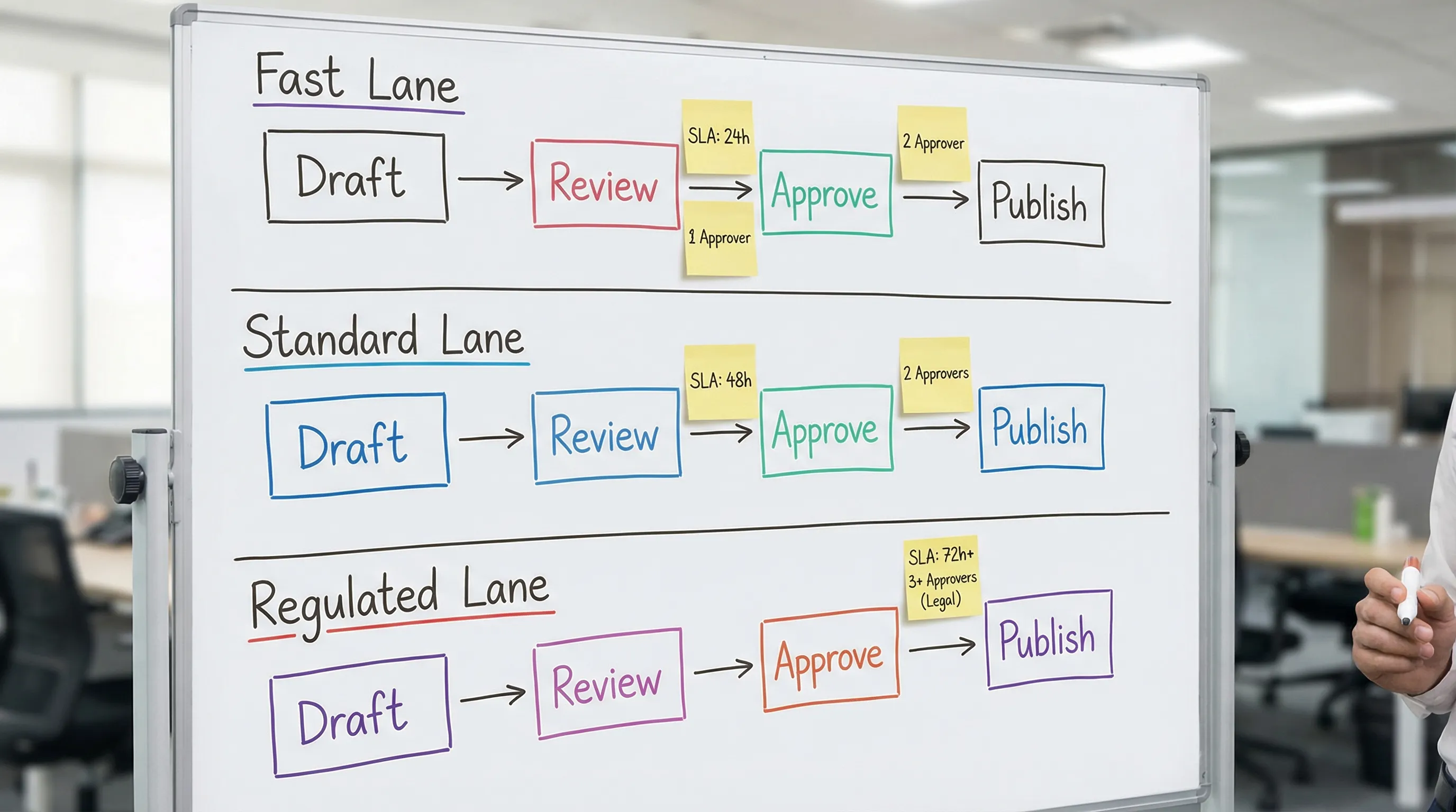 A simple policy that prevents endless waiting is auto-approval on silence for Fast lane assets (if you can support it contractually and culturally). If auto-approval is too aggressive, use “escalate to decider after SLA.”