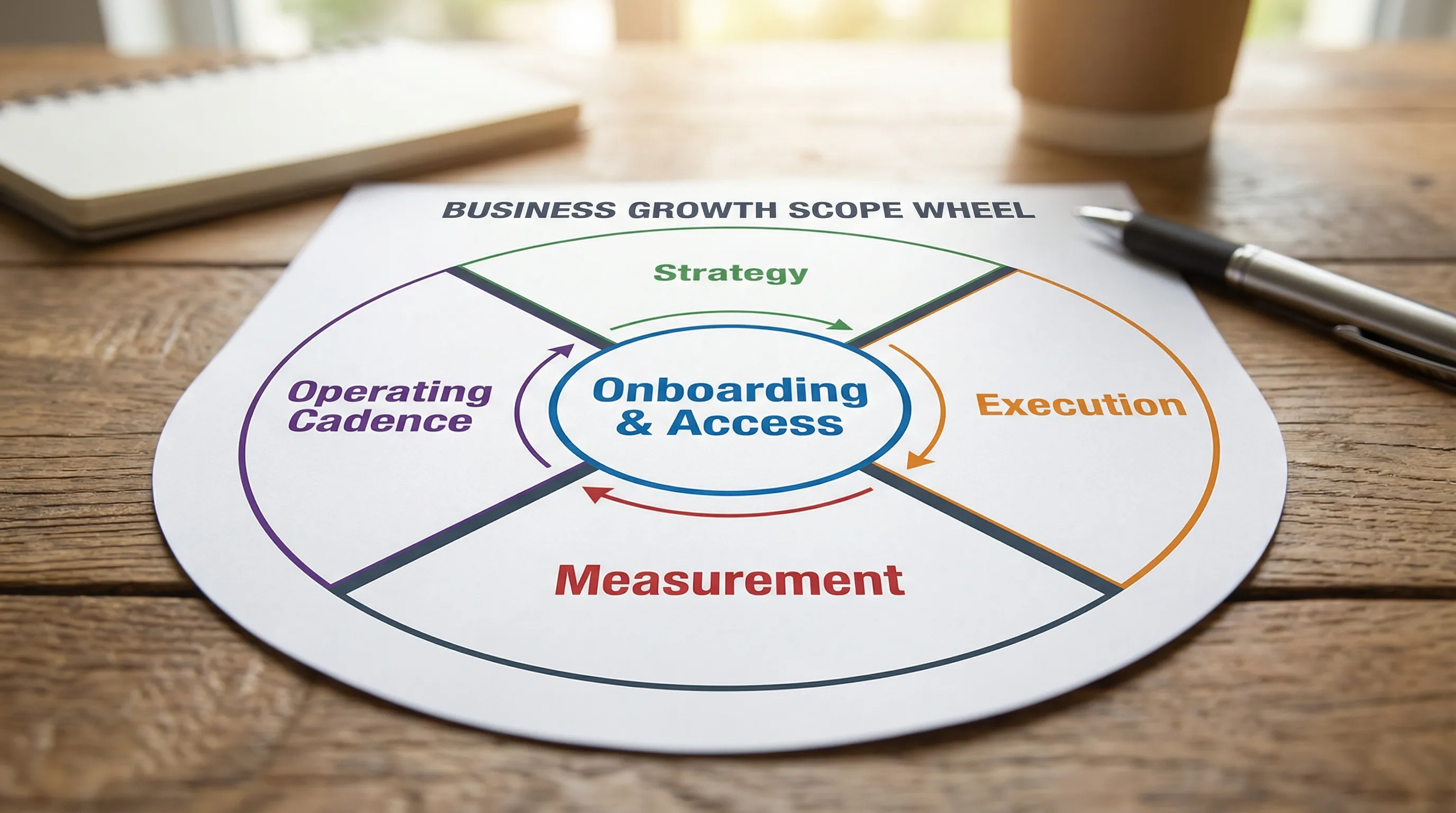 If strategy is included, it should produce artifacts, not just meetings. Look for deliverables like a one-page “win definition,” a channel plan, a testing roadmap, and a tracking checklist.