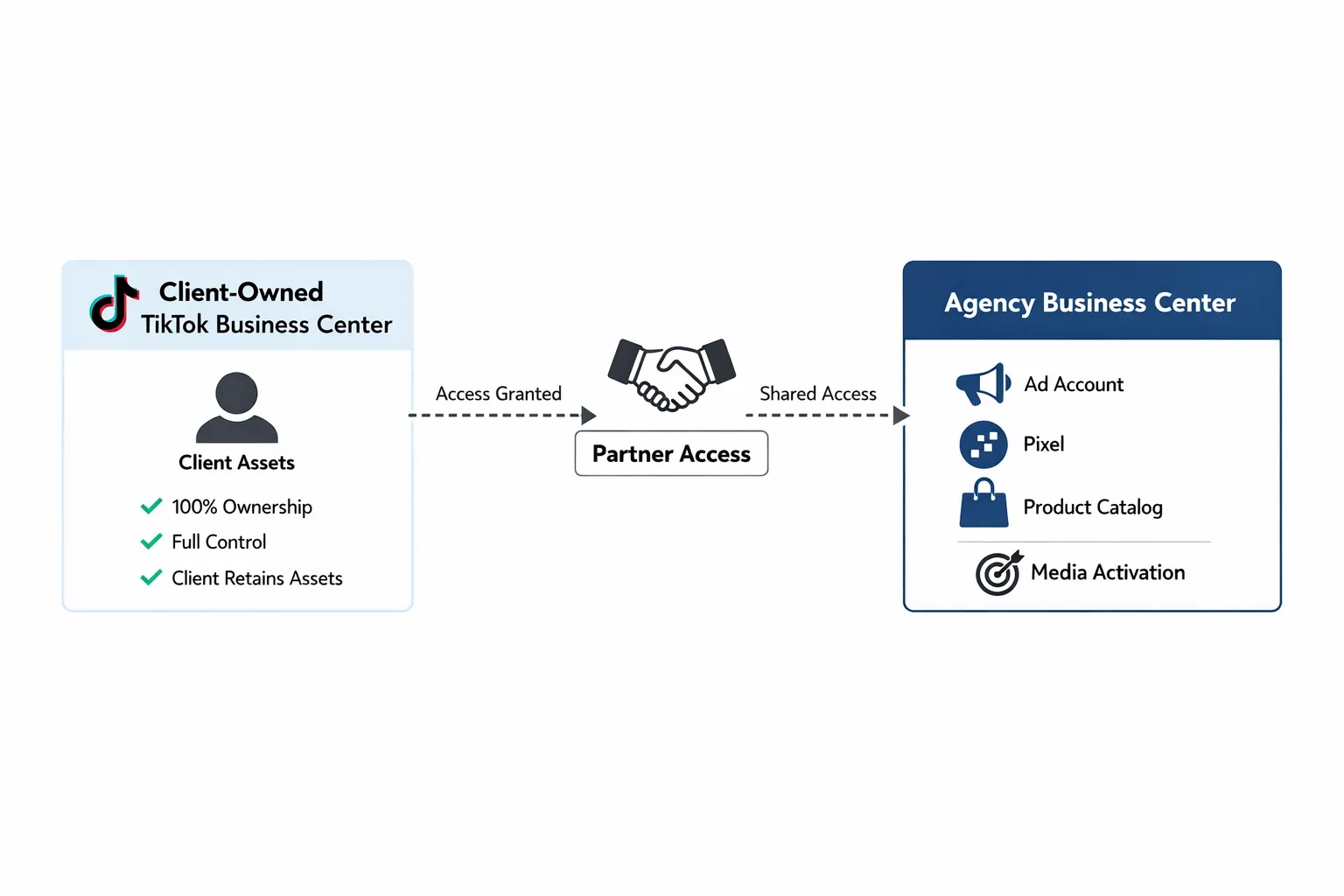 On TikTok, the client should own the assets and grant your agency scoped access. This preserves security, reduces lock-in risk, and makes audits simple.